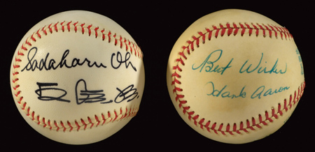 Description:Hank Aaron and Sadaharu Oh vintage single signed baseballs c.1970s. Includes Reach L.MacPhail OAL ball, signed on the side panel "Best Wishes Hank Aaron" in ink rating 8/9 out of 10; unmarked ball signed on the side panel "Sadaharu Oh" in both English and Japanese in black marker rating 9 out of 10. Light toning. Includes auction LOA from JSA and letter of provenance from Nita Killebrew: Overall EX/MT
