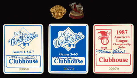 Description:Harmon Killebrew's 1987 World Series press pins and clubhouse passes. Original press pins as issued by the Twins and Cardinals retaining back closures and displaying little to no wear; set of (3) plastic "Clubhouse" passes including (1) for the 1987 ALDS and (2) for the World Series (combined representing all 7 games). Passes have been signed on the front "Harmon Killebrew" rating 8 out of 10 and exhibit light wear/toning. Includes auction LOA from JSA and letter of provenance from Nita Killebrew: EX/MT-NM