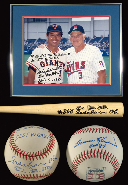 Description:Sadaharu Oh autographed ball and photo to Harmon Killebrew with signed bat. Rawlings G.Budig OAL ball signed on the sweetspot "Sadaharu Oh" in both English and Japanese and inscribed on the panel above "To Harmon Best Wishes". Ink signature rates 8/9 out of 10. Touch of smudge to personalization and small blemish to stampings on ball; 11"x14" Color photograph bearing same personalization/signature along with "Aug 5, 1991" date rating 9 out of 10 (framed); 33.5" Mizuno baseball bat signed on the barrel with added "#868" notation rating 7 out of 10. Light surface wear and touch of scattered loss to bat; and Baseball Hall of Fame logo ball (touch of wear to logo) signed on the sweetspot "Harmon Killebrew HOF 84" ink rating 8 out of 10. Includes auction LOA from JSA and letter of provenance from Nita Killebrew: EX/MT-NM