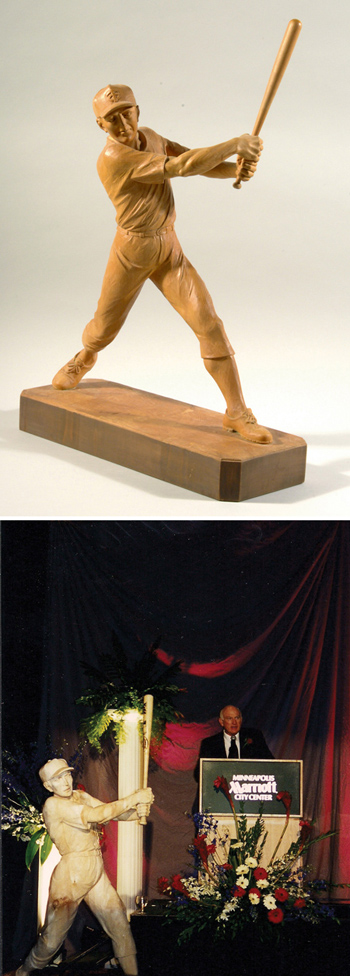 Description:Hand carved wooden statue of Harmon Killebrew by Giuseppe Rumerio. Exceptionally well executed rendering of Harmon Killebrew as carved by the noted wood sculptor from the Val Garena region of Italy. Stands 25" tall at very tip of bat with 7"x18" footprint. Signed on the base, within the work, "G.Rumerio 2001" and remains in very fine overall condition. Includes a series of photographs taken at a 2001 event honoring Killebrew in which Rumerio can be seen crafting a larger (near life size) version of this piece. Includes letter of provenance from Nita Killebrew: NM