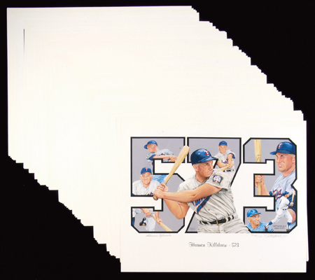 Description:Lot of (69) Harmon Killebrew signed limited edition lithographs. Large grouping of 16"x20" prints commemorating 573 career homeruns, each signed within the lower white border "Harmon Killebrew." Also signed by the artist Madden and hand numbered out of 100 with "PP" (printer's proof) designation. Includes auction LOA from JSA and letter of provenance from Nita Killebrew: NM-MT