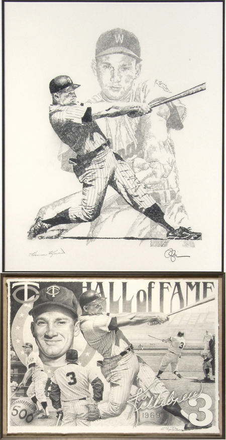 Description:Lot of (2) Harmon Killebrew original artwork pieces. Exceptionally well executed pencil on rag paper composite of several Killebrew related images, signed at lower right by the artist Terrance Fogarty. Gallery style framed to approximately 32"x40"; Large format pencil drawing of Killebrew in Senators uniform as background and Twins uniform batting in foreground. Signed by both Killebrew (pencil rating 8/9 out of 10) and the unidentified artist. Framed to 29.5"x34" overall. Includes letter of provenance from Nita Killebrew: NM