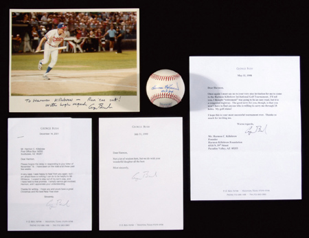 Description:Lot of (4) President George H.W. Bush autographed pieces as related to Harmon Killebrew. Includes 8"x10" color photograph of Bush playing baseball, signed within the lower border "To Harmon Killebrew - Run em out! With high regards, George Bush" and (3) letters (dated 1998, 1999, and 2001), each signed "George Bush." Ink and marker signatures rate 7/8 to 9 out of 10. Includes "Harmon Killebrew HOF 84" autographed Hall of Fame logo baseball (8 out of 10 in blue ink), auction LOA from JSA, and letter of provenance from Nita Killebrew: Overall NM