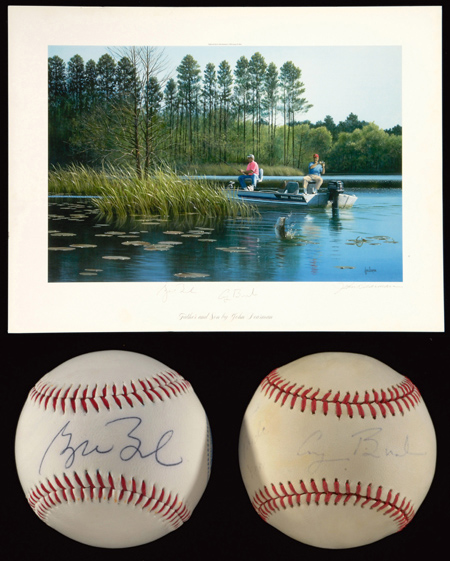 Description:President George Bush Sr. and Jr. single signed baseballs and print (3 pieces). "Father and Son" titled 16.5"x22" print of Bush Sr. and Jr. fishing has been signed by both within the lower margin in pencil rating 8/9 out of 10. Includes Rawlings B.Brown OAL baseball signed "To Harmon, With Pride in You, George Bush." Signature rates 6/7 out of 10, ball has minor toning; Presidential seal baseball with facsimile signature printed on has been authentically signed on the sweetspot, "George W. Bush" in ink rating 8 out of 10. Includes original presentational box for G.W. signed ball, auction LOA from JSA, and letter of provenance from Nita Killebrew: EX-NM