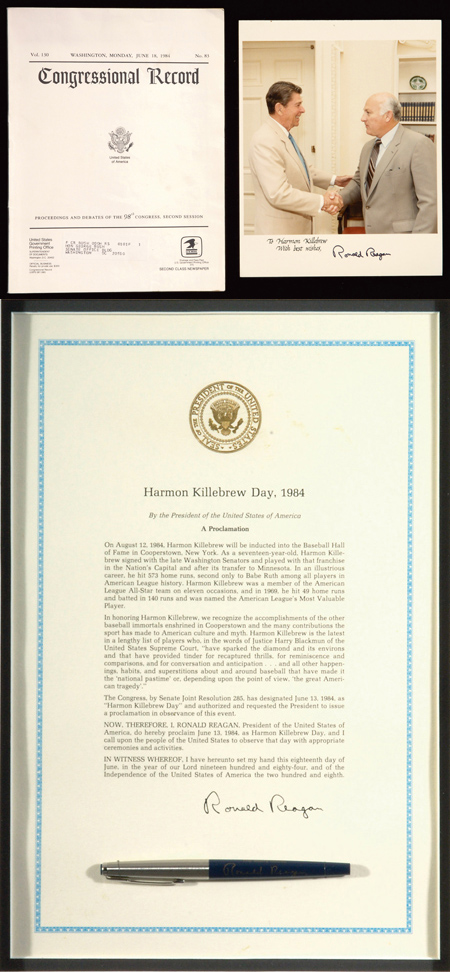 Description:1984 President Ronald Reagan "Harmon Killebrew Day" proclamation display. Framed 15"x19.5" display housing presentational copy of June 18, 1984 "Harmon Killebrew Day" proclamation as was signed into law by President Ronald Reagan. The document has raised seal at top and facsimile (printed) signature at bottom. Mounted below is a pen similar to that which Reagan used while in office. Although it can not be stated with certainty, it is likely that this is the pen which Reagan used and later presented to Killebrew. It has long been a tradition of Presidents to make such presentations. Includes autopen signed photo from Reagan to Killebrew and period copy of "Congressional Record" which lists the approval having been forwarded from the offices of George Bush with his return address label on outside. Letter of provenance from Nita Killebrew: NM