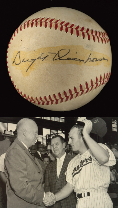 Description:President Dwight D. Eisenhower single signed baseball c.1959 with related period photographs. Reach William Harridge Official American League baseball has been signed on the side panel, "Dwight D. Eisenhower" in black ink. Signature rates 8/9 out of 10 remaining very well preserved, the result of a small amount of shellac applied in the period. Ball displays mild toning with light scattered wear and retains well defined stampings. Small "5/29/59" ink notation appears on the side panel. Eisenhower was an ardent baseball fan and attended games played in Washington throughout his years in office. In total he is known to have been at (13) games with this being his only Griffith Stadium appearance during the 1959 season. Includes vintage 11"x14" sepia toned photograph as taken that day; framed for display with inset metal placard reading "Harmon Meets Ike, June 1959" and 11.5"x10" black and white photo with Killebrew and Eisenhower visible stamped "Life Magazine" on back (tear at lower edge). Includes auction LOA from JSA and letter of provenance from Nita Killebrew: Ball EX, Sig. NM