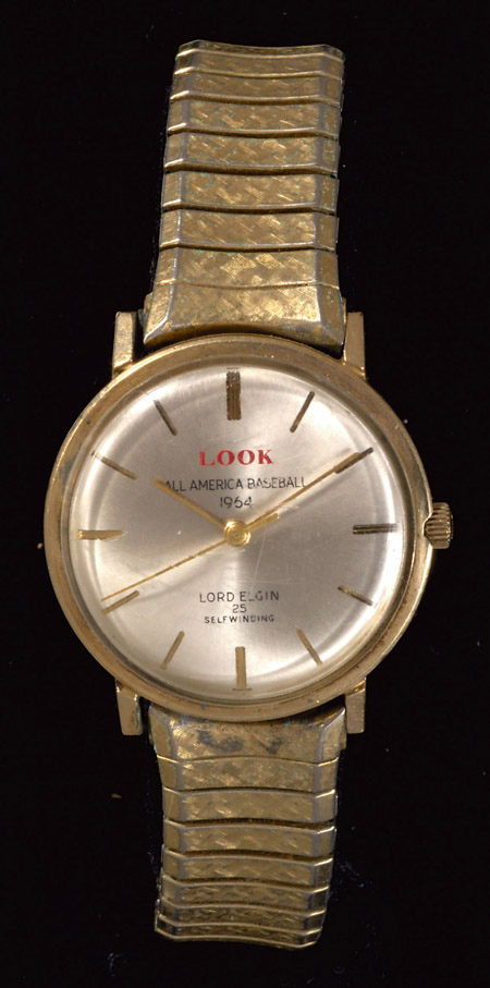 Description:1964 Harmon Killebrew "Look All America Baseball" presentational wristwatch. Men's Lord Elgin self winding wristwatch with mother of pearl finish face having "Look All America Baseball" lettered on. Engraved on the back "Harmon Killebrew" and marked "10K Gold Filled." Remains in working order and was clearly prized by Killebrew with evident wear inclusive of some surface scratching to glass portion and hint of loss to gold finish on band. Includes letter of provenance from Nita Killebrew: EX