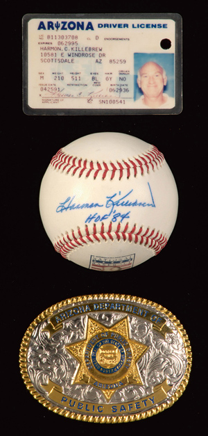 Description:Harmon Killebrew's Arizona drivers license and belt buckle. Photographic license as issued in 1991 having printed signature on front displays expected moderate wear with hole punch cancellation at upper right. Includes his personal "Arizona Department of Public Safety" belt buckle (unused), "Harmon Killebrew HOF 84" autographed Hall of Fame logo baseball (8 out of 10 in blue ink), and letter of provenance from Nita Killebrew: EX-NM