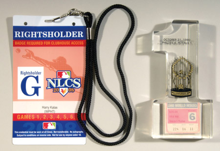 Description:1980 World Series souvenir from Kalas' collection with his 2008 NLCS credentials. Includes 1980 World Series game (6) ticket stub housed in Lucite display which takes the shape of a number "1" and has pertinent game information lettered within. Small decal affixed to underside has been signed "Harry Kalas HOF 2002" in blue ink rating 8 out of 10; Heavy stock 2008 NLCS Rightsholder clubhouse pass has "Harry Kalas (WPHT)" decal affixed. Light wear throughout. Includes auction LOA from JSA (autograph) and letter of provenance from the Kalas family: Overall EX/MT
