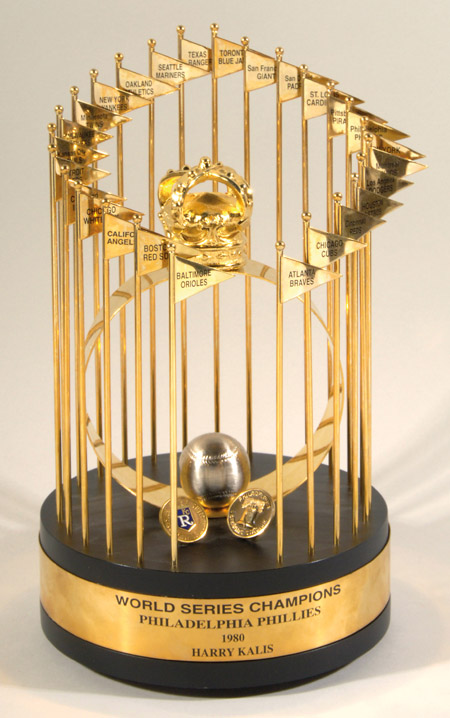 Description:1980 Philadelphia Phillies World Series trophy presented to Harry Kalas. Original high quality figural trophy fashioned after the full sized version representing one of the most recognizable and desirable Championship season mementos. Those with direct provenance to noted franchise figures are seldom offered with this example representing the best to have come to market with a direct chain of ownership to a team icon. Stands 12" tall featuring brass pennants with team names around the perimeter of a large brass circle with a crown finial. Phillies and Royals World Series press pin facades adorn the center area. Brass band which encircles the base has been lettered "World Series Champions Philadelphia Phillies 1980 Harry Kalis" on the front. Rectangular white sticker affixed to underside of trophy has been signed "Harry Kalas HOF 2002" in ink rating 8 out of 10. The trophy remains very clean with minimal overall wear. Includes auction LOA from JSA (autograph) and letter of provenance from the Kalas family: NM