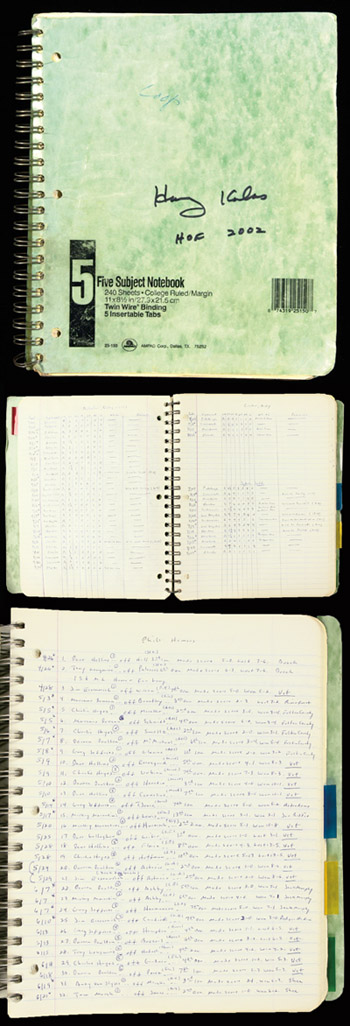 Description:Harry Kalas autographed 1995 Philadelphia Phillies personal working notebook. Spiral bound multi-section notebook as kept by Harry Kalas during the 1995 season offers a fascinating glimpse into the level of preparation taken by one of the all time broadcast personalities. Within, Kalas has recorded literally thousands of individual Phillies team members pitching statistics, homeruns, performance vs. opposing pitchers, ejections, significant dates, his pre and post game guests, and more. All is neatly written in concise format in ink. Very well preserved (given every day nature of use) with moderate evident wear throughout. Signed on the cover, "Harry Kalas HOF 2002" in marker rating 8 out of 10. Includes auction LOA from JSA (autograph) and letter of provenance from the Kalas family: NM