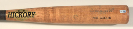 Description:July 16, 2012 Neil Walker game-used baseball bat. Old Hickory brand baseball bat having "33.5 Pro Maple NW1" and "Neil Walker" block lettered into the barrel end. Extensive usage wear evident throughout with deeply impressed ball transfer and stitch marks, stick-um on handle, and "H" shaped handle crack. MLB Authentication hologram (FJ 743817) confirms the bat was cracked during a game at Colorado: EX