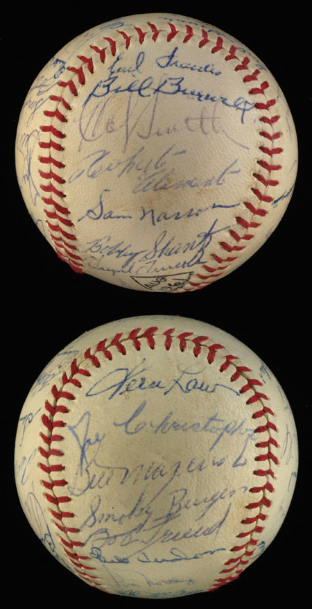 Description:1961 Pittsburgh Pirates team signed baseball. Unmarked baseball has been signed by (32) including Clemente, Mazeroski, Burgess, Law, Virdon, Friend, Labine, Face, Stuart, Haddix, Groat, Groat, Trucks, Hoak, and others. Murtaugh is clubhouse signed. Ink signatures rate 7 to 9 out of 10. Ball displays a light even cream coloration and has small handwritten year identifier. Uncommonly complete. Includes auction LOA from JSA: EX/MT