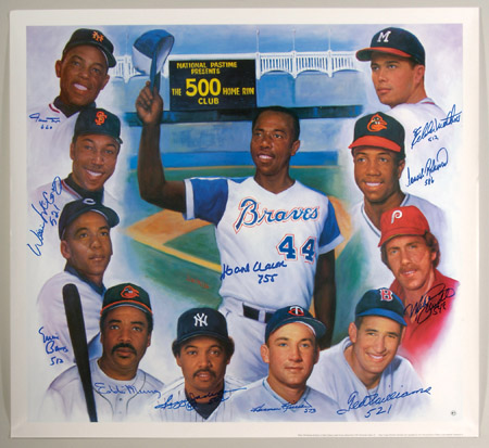 Description:500 Home Run Club autographed poster. Color 27"x29" commemorative poster depicting (11) 500 Home Run Club Members, each having signed their respective image including Williams, Aaron, Schmidt, Killebrew, Jackson, Robinson, Mathews, Banks, McCovey, Mays, and Murray. Signatures and inscriptions rate 9/10 out of 10 with all but Murray having inscribed their homerun total. Hint of light wear entirely confined to corners/edges would not be visible when framed for display. Includes auction LOA from JSA and letter of provenance from Claudia Williams: NM