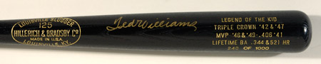 Description:Ted Williams autographed limited edition "Legend of The Kid" commemorative baseball bat. Louisville Slugger 125 model baseball bat done in black finish has been gold foil stamped in the barrel "Legend of The Kid, Triple Crown '42 & '47, MVP '46 & '49 - .406 '41, Lifetime BA .344 & 521 HR." Limited edition numbered 240 of 1000. Signed in gold paint pen rating 8/9 out of 10. One of a very limited number from the edition which have been publicly released. Includes auction LOA from JSA and letter of provenance from Claudia Williams: NM