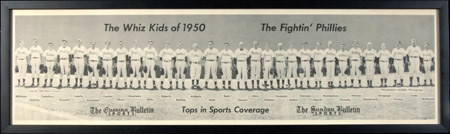 Description:1950 Philadelphia Phillies team panoramic photograph. Framed printed photographic premium as issued by the Sunday Bulletin picturing the NL Champion Phillies posed in full uniform. Players are identified underneath their respective images to include Ashburn, Roberts, Simmons, Hamner, and Waitkus. Very clean overall with two light surface wrinkles and a very small blue ink marking at far right edge. 10"x36": EX