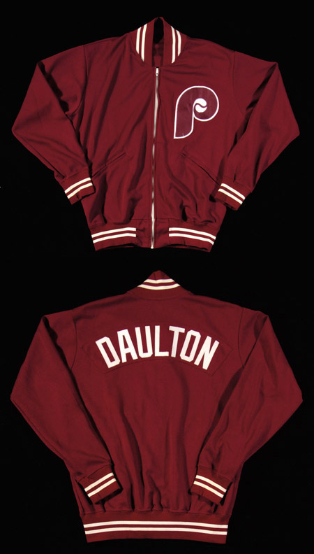 Description:Darren Daulton Philadelphia Phillies professional model warm-up jacket c.1980s. Maroon lightweight jacket with Phillies "P" logo on front has "Daulton" nameplate on back. "Rawlings" tagging on interior with the size "42." Light evident usage and wash wear. Includes LOA from Hunt Auctions: EX