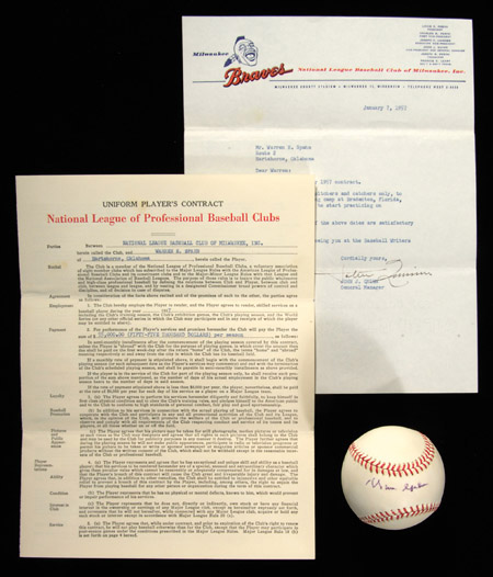 Description:Warren Spahn 1957 Milwaukee Braves player contract. Significant original contract as issued to Spahn for the 1957 Braves World Championship season in which he captured the Cy Young award with an annual salary of $55,000. Unsigned on the interior page. Accompanied by an original January 7, 1957 typewritten letter on Braves stationery as sent to Spahn with the contract signed by General Manager John Quinn along with the original envelope. Includes Warren Spahn single signed W.White NL ball (lt. toning). Includes auction LOA from JSA: EX-MT