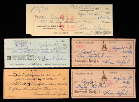 Description:Lot of (5) Warren Spahn autographed personal checks with multiple signatures. Includes 1953 example signed twice on the front, made out to Warren Spahn Restaurants, (2) 1949 examples each made out to "Cash" signed on front and endorsed by Spahn on the back, and (2) 1965 examples signed on front and endorsed by Spahn on the back. Desirable grouping which were the only multi-signed exemplars in the Spahn collection. Includes auction LOA from JSA and (5) individual COAs from the Spahn Family: Range EX-NM