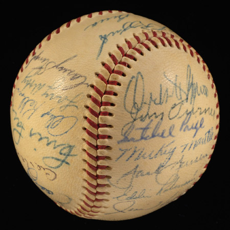 Description:Fine American League All-Star team autographed baseball c.1952-1953. Cream color Giles NL ball signed by (26) members of the 1953 AL All-Star team including Paige, Mantle, Berra, Rizzuto, Doby, Stengel, and Minoso. Signatures range from 7 to 10 out of 10. Includes auction LOA from JSA: EX/MT-NM