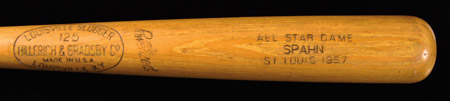 Description:Warren Spahn 1957 All-Star Game professional model baseball bat. Original bat as issued to Spahn for use in the MLB All-Star Game played at St. Louis in 1957. Louisville Slugger 125 model bat measures 34 1/2" long and weighs 29.6oz. Model M159 stamped on knob end with "All Star Game SPAHN St. Louis 1957" impressed on barrel end. Bat shows light use. Includes LOA from Hunt Auctions: EX
