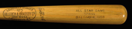 Description:Warren Spahn 1958 All-Star Game professional model baseball bat. Original bat as issued to Spahn for use in the MLB All-Star Game played at Baltimore in 1958. Louisville Slugger 125 model bat measures 34" long and weighs 31.2oz. Model M159 stamped on knob end with "All Star Game SPAHN Baltimore 1958" impressed on barrel end. Bat shows light if any use. Includes LOA from Hunt Auctions: EX