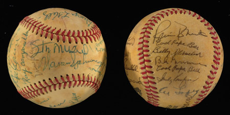 Description:Lot of (2) Hall of Famer autographed baseballs to include: Toned Feeney NL ball signed by (24) players including Williams, Koufax, Dickey, Ford, Cronin, Musial, and Snider. Signatures range from 5 to 8 out of 10: Ball: VG, Signatures: Range VG-NM and Toned Feeney NL ball signed by (23) players including Musial, Spahn, Grimes, Ruffing, Cronin, Mathews, and Bell. Campanella is secretarial signed. Signatures range from 5 to 8 out of 10: Ball: VG-EX, Signatures: Range VG/EX-NM. Includes auction LOA from JSA.