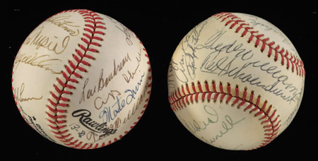 Description:Lot of (2) Hall of Famer autographed baseballs to include: Lt. toned B.Brown AL ball signed by (22) players including Williams, Mize, Reese, Musial, Irvin, Feller, and Killebrew. Signatures range from 6 to 9 out of 10: Ball: EX, Signatures: Range EX-NM and off white Giamatti NL ball signed by (18) players including Williams, Musial, Lemon, Kiner, Mize, and Gomez. Signatures range from 7 to 9 out of 10: Ball: EX-MT, Signatures: Range EX-NM. Includes auction LOA from JSA.