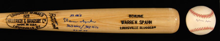 Description:Warren Spahn autographed baseball bat and single signed baseball. Limited edition Louisville Slugger Warren Spahn model baseball bat signed on the barrel, "35 HR's Warren Spahn 363 Wins/363 Hits" numbered 23 of 35: NM along with "Warren Spahn" single signed L.Coleman NL ball: EX-MT. Includes auction LOA from JSA