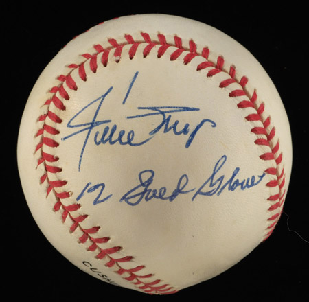 Description:Willie Mays single signed baseball with rare "12 Gold Gloves" inscription. Rawlings W.White Official National League baseball has been signed on the side panel, "Willie Mays" and inscribed below "12 Gold Gloves." Blue ink signature rates 8/9 out of 10. Ball displays a touch of light toning. Includes auction LOA from JSA: Ball EX/MT-NM, Sig. NM-MT