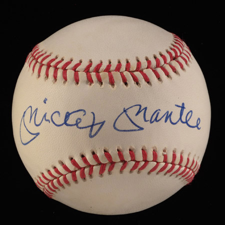 Mickey Mantle single signed baseball. Rawlings B.Brown Official American League baseball has been signed on the sweetspot in blue ink, "Mickey Mantle." Signature rates a bold 8/9 to 9 out of 10. Includes auction LOA from JSA: NM