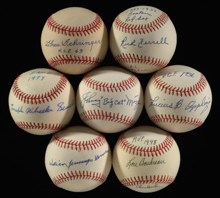 Description:Lot of (7) Hall of Famer single signed and inscribed baseballs. Rawlings Official AL/NL baseballs, each signed in highly unusual full name and/or statistic inscribed manner. All originated from the same source whom had a very limited number done at a time when few had the foresight to ask such requests. Includes Charles Gehringer ("HOF 49"), Joe Sewell (full name and "Hall of Fame 1977 1920-1933"), Luke Appling (full name and misdated "HOF 1936"), Johnny Mize ("Big Cat"), Lou Boudreau ("MVP 1948 Cleveland"), Billy Herman (full name), and Rick Ferrell ("1933-1937 Boston Red Sox A.L. Catcher"). Ink signatures rate 8 to 9 out of 10 with Sewell slightly lesser. Varying degrees of extremely minor to moderate toning to a few pieces. Includes auction LOA from JSA: EX/MT-NM/MT