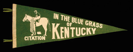 Description:Late 1940s "Citation" pennant. Full sized green felt pennant having screened on horse/rider graphic with "Citation" captioned below. Titling at center reads, "In The Blue Grass of Kentucky." Fine condition overall with a hint of incidental to light wear and a choice display piece as relates to one of the great racing horses: Strong EX/MT