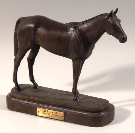 Description:"Affirmed" (standing position) bronze sculpture by Marilyn Newmark. Titled with placard at base front, "Affirmed Horse Of The Year 1978." Signed within the work with date of 1979 and limited edition numbered 46/150. Stands just under 11" tall with 3.5"x10.75" base: NM