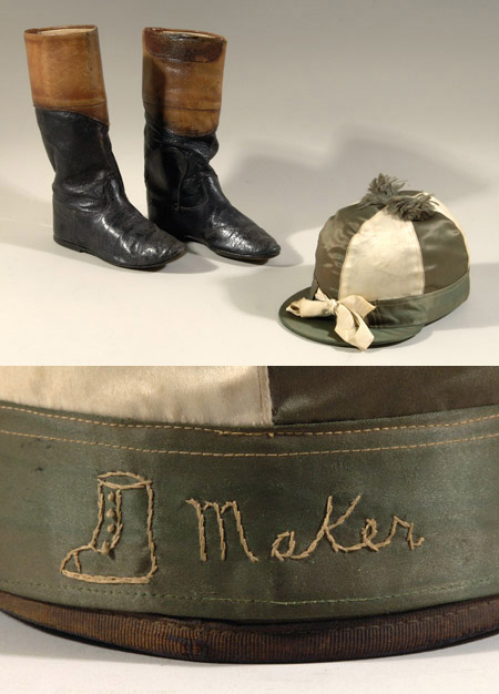 Description:Important Willie Shoemaker attributed hat, helmet, and boots from his first winning ride in 1949 with strong provenance. Trio of pieces as relate to the first win of Shoemaker's celebrated career as one of the greatest jockeys of all time to include: green and white silk hat with stitched in likeness of a shoe on back with "maker" directly to the right. In very fine condition overall with light/moderate evident usage wear; helmet insert with considerably more wear visible and manufacturer's stampings largely worn off (size "7" label remains intact); and well worn brown and black leather riding boots with partially visible interior "Kroop's" manufacturer's and size "1 1/2" stampings. Shoemaker is shown in included Polaroid snapshot seated within his home as these pieces are displayed next to him and a notarized affidavit (signed on his behalf by a caretaker) reads in part, "...I have been requested by Mr. Shoemaker to signed below acknowledging that recognizes the tack (helmet, cap, and boots) that are in possession of William Saunders to be the tack that he used for his first winning ride, Shafter V at Golden Gate April 20, 1949." Also referenced is additional history relayed in copy of a Shoemaker signed statement which traces ownership through jockey and Chief Racing Stewart for California Alfred Shelhamer whom Shoemaker had gifted the material. Rare and significant offering of early career materials as related to one of the most storied riders of all-time likely represents a singular opportunity with particular note to the strong chain of provenance: Overall EX