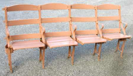 Description:Shibe Park row of (4) connected stadium seats. Desirable row of seats as utilized in Shibe Park, later renamed Connie Mack Stadium, retaining their original pink over green painted surface. General moderate surface crazing and wear consistent with long term outdoor use though in lesser degree than is typically encountered. Rust is scattered throughout in small isolated areas. Seats remain free standing with all leg stanchions having intact foot portions (often missing): EX