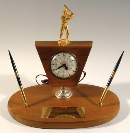 Description:1966 Warren Spahn Milwaukee Braves Distinguished Alumnus Award. Significant team award as presented by the Milwaukee Chapter of the BBWAA for his fine career with the Braves. Mahogany desk top inkwell displays a pedestal base electric clock with two fountain pen receptacles on either side. Inscribed brass placard remains affixed to the base dated January 23, 1966. 13" long x 12" tall. Includes a period 3"x5" color image of Spahn receiving the award along with Hank Aaron and Eddie Mathews: EX-MT