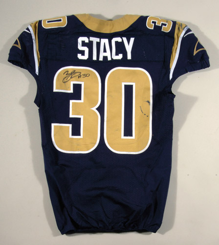 Description:2013 Zach Stacy St. Louis Rams game-used and autographed home jersey (Salute to Service game) (NFL Auctions - PSA/DNA). Blue jersey with player number "30" sewn on front, back, and shoulders has "Stacy" nameplate on back. Proper Nike On Field Skill (size 40) and year "2013" tagging in collar. Strong usage wear evident throughout, has been signed on the back in marker rating 8 out of 10. As relayed by NFL Auctions, this jersey was used in November during a Salute to Service game. Includes COA from PSA/DNA with matching numbered certification label affixed: EX