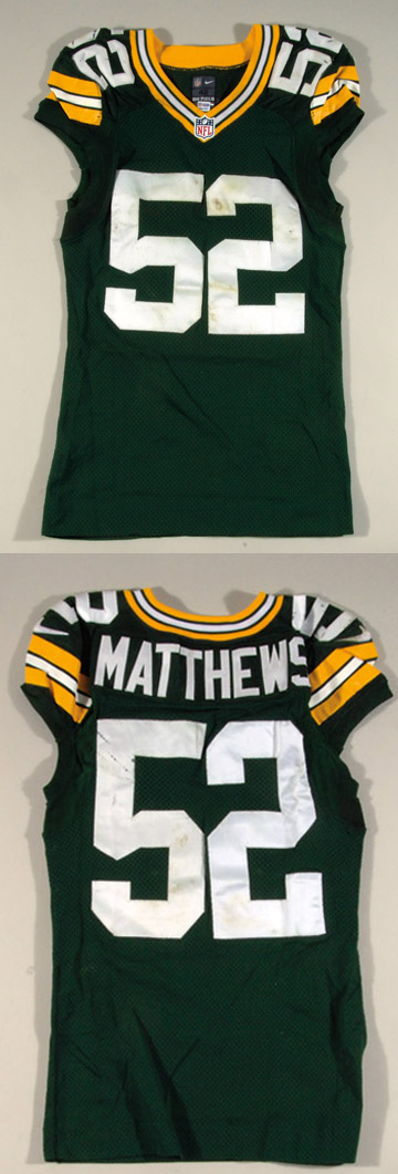 Description:2013 Clay Matthews Green Bay Packers game-used home jersey (Salute to Service game) (NFL Auctions - PSA/DNA). Green jersey with player number "52" sewn on front, back, and shoulders has "Matthews" nameplate on back. Proper Nike On Field Line (size 42) and year "2013" tagging in collar along with "+6 Length" tag. Outstanding usage wear evident throughout. As relayed by NFL Auctions, this jersey was used in November during a Salute to Service game. Includes COA from PSA/DNA with matching numbered certification label affixed: EX