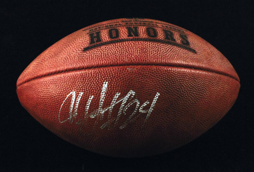 Marshawn Lynch autographed football. Official Roger Goodell "NFL Honors" commemorative football by Wilson signed on side panel by Lynch in silver paint pen. Includes COA from NFL with matching serial number sticker affixed: NM-MT