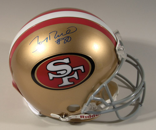 Jerry Rice autographed San Francisco 49ers helmet. Full size Riddell VSR-4 ProLine helmet signed in blue sharpie across the top. Includes COA from NFL with matching serial number sticker affixed: NM-MT