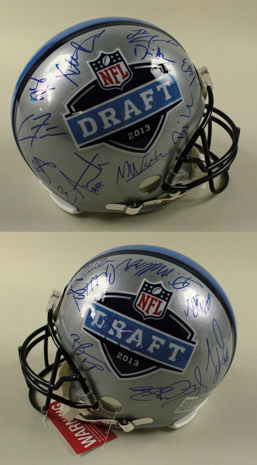 Description:2013 NFL Draft autographed helmet. Full size Riddell VSR-4 NFL Draft Commemorative ProLine helmet signed in blue sharpie by a number of 2013 NFL Draft picks from a fine class to include Lane Johnson, Luke Joeckel, and Eric Fisher. Includes COA from NFL with matching serial number sticker affixed: NM-MT