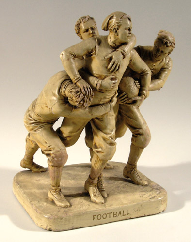 Description:Rare "Football" figural group by John Rogers c.1890s. The most desired and valuable of the various Victorian figural sculptures by noted artist John Rogers, depicts a group of three men tackling a ball carrier. The group was modeled after Rogers' three sons and the captain of the Yale football team, William Herbert. Rogers' sons all attended Yale, and along with Herbert, were documented to have posed for studies preceding the creation of the offered statue. The piece consists of a plaster composite with light brown pottery glaze. Rogers' attention to detail is evident in the various nuances of the piece including the players' uniforms and melon style football. Given its original fragility, the offered example remains in fine overall condition with some areas of surface flaking and some relatively minor areas of surface wear including a few chips with one on the nose of the ball carrier. Impressed "Football" titling remains on the front of the base with "Rogers New York" impressed onto the top of the base. One of only six examples we have handled in over 21 years ranks as the pinnacle of 19th century football display pieces: VG-EX