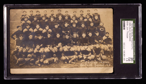 Description:Important rookie era Jim Thorpe Carlisle Indians team photographic postcard c.1908. Notably scarce real photographic postcard picturing a very young Jim Thorpe posed in full uniform as a member of the Carlisle Indians football team. The offered postcard is one of the earliest of its type given that Thorpe began his athletic career on the Carlisle Indians track and field team in 1907. Titled at bottom right, "Carlisle Indian Football Squad 08". Reverse is unused with some light to moderate soiling and small "15 cents" notation. Outstanding image quality with small corner crease at lower right. First example that we have encountered: SGC 20 Fair (VG-EX appearance)