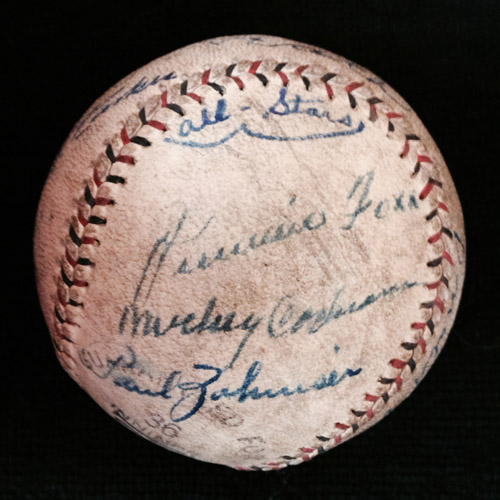 Description:1930s Pacific Coast League signed baseball with Foxx and Cochrane. Red and black stitched Wilson “Pacific Coast League” baseball has been signed by (14) including Major Leaguers Jimmie Foxx and Mickey Cochrane along with then PCL players Jack Wilson, Art Parker, Herm Pillette, and others. Period fountain pen signatures rate 7 to 8 out of 10 and it is possible that two or three have been enhanced (neither Foxx or Cochrane). Ball displays usage wear with some soiling and has “all-stars” written on in unknown hand. Although dating can not be pinpointed it is possibly related to the 1933 Portland Beavers who were a Philly A’s affiliate. Includes LOA from Hunt Auctions: Ball VG-EX, Sigs. EX/MT-NM