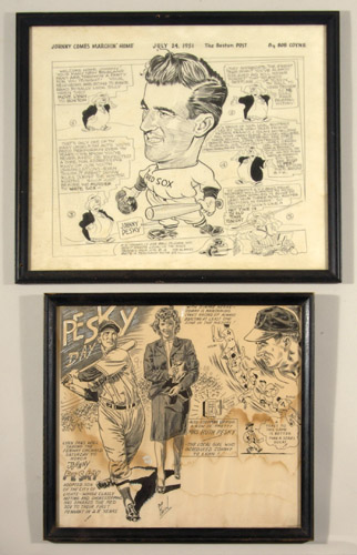 Description:Lot of (2) Johnny Pesky original cartoon artwork pieces c.1940-1950s to include: Original artwork piece by Bob Coyne dated July 24, 1951 with several vignette images of Pesky. 15"x17" framed: EX and "Pesky Day" c.1946 artwork by Bob Walsh depicting Pesky during the 1946 AL pennant winning season. 12"x14" framed with some age toning/staining: VG