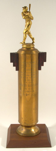 Description:1941 Johnny Pesky Sporting News American Association "Player of The Year Award." Important honor as bestowed upon completion of the 1941 season which would mark his last in the Minor Leagues before Johnny Pesky joined the Boston Red Sox. Wooden base supports oversized metal column on which is engraved, "Presented to Johnny Pesky, Louisville, In Recognition Of Being Named The Most Valuable Player of The American Association In 1941, By A Committee For The Sporting News." Set atop is a figural batter. Light surface soiling/spotting with small break to bat in hands of batter. Highly visual presentational trophy stands 27" tall with 8"x8.5" base: EX/MT