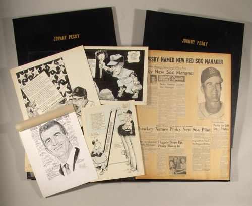 Description:Lot of (3) large format Johnny Pesky scrapbooks. Trio of oversized (20"x25") scrapbooks with faux leather wrapped covers each impressed with "Johnny Pesky" name in gilted block lettering. Contained throughout is an assortment of material as relates to his lifetime in baseball running from playing days to present and includes photographs, newspaper articles/clippings, several pieces of original illustration artwork, assorted ephemera, and others (please note: books are not full and have many blank pages throughout). Varying degrees of typical wear: Overall EX/MT