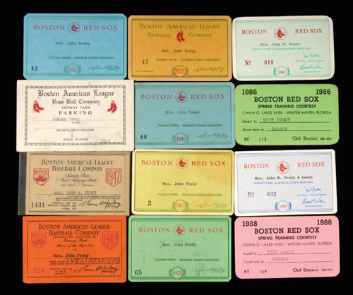 Description:Lot of (17) 1947-2001 Boston Red Sox related passes and vintage Pesky business card. Includes vintage Johnny Pesky Red Sox logo business card; Pesky's 1947 Fenway Park parking pass; (12) 1947-2001 team issued season passes done on heavy paper stock with either "Mrs. John Pesky", "Ruth Pesky", or similar typed in bearer area; and (4) 1986-1990 Red Sox Spring Training Courtesy cards/passes issued to Ruth Pesky. Varying degrees of wear throughout: Range VG-NM