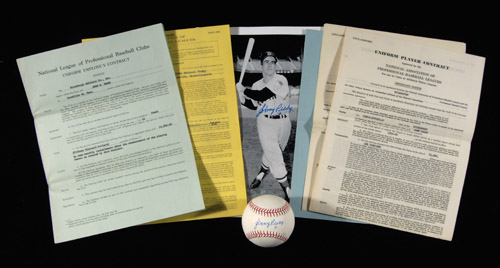 Description:Collection of Johnny Pesky original player/coach contracts to include: (2) 1959-1960 Cinco-Estrellas team (unsigned); 1984 Boston Red Sox contract signed by AL President B.Brown, Red Sox Vice President Lou Gorman, and Pesky; 1968 Columbus signed by Pesky and team official; 1965 Pittsburgh Pirates signed by Joe L. Brown; and 1967 Pittsburgh Pirates signed by Joe L. Brown. Lot is accompanied by Johnny Pesky single signed Selig OML ball and 8"x10" photograph. Includes auction LOA from JSA (signatures): Range EX-NM